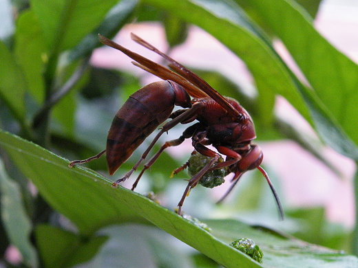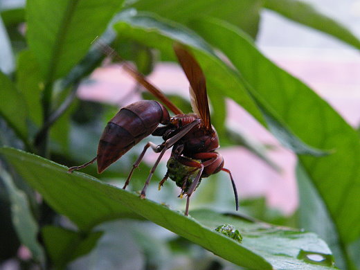 運氣好的話,是可以看到蝴蝶羽化成蝶,運氣不好的話,蛹可能被寄生蜂捷足先登,永無再見天日,樹葉上的幼蟲也一樣,雖然頭上觸角有威嚇作用,但對棕長腳蜂完全不起作用,從第一張見到棕長腳蜂降落前,到最後一張嘴含蟲肉丸子回巢,連續在旁拍照觀察有10分鐘之久,這已經是第二回合,大鳳蝶幼蟲逐漸變成丸子,雖說殘酷,但,這就是活生生的生態,當天有許多人跟我一起看到這景象,興致一來,大家也一起加入自然觀察的活動中。