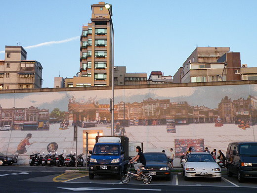 下圖是薄茵萍的「大稻埕風華再現」第三幅河岸壁畫,她以超現實的手法,呈現當年富庶、融合東西方多元風華的大稻埕街景建築風貌,包括霞海城隍廟、永樂布市、偶戲館建築都在圖中,透過由上而下的天空、老房子、人們在寬闊廣場活動遊憩等三段畫面呈現,期盼有一天可以讓大稻埕再現風華。