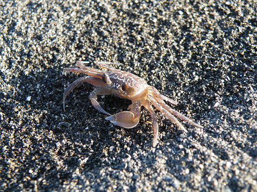 外號鬼蟹、幽靈蟹、痕掌沙蟹。幼蟹體色和沙很接近,具有很好的保護色,長大時會呈紅色調,極為醒目。也會配合環境及光線的不同,改變身體的顏色,好像變色龍一般。四對步腳特別長,適合沙灘賽跑。螯腳一大一小,還有一條摺痕。居住在高潮線附近的沙灘,喜歡在洞口附近堆滿鬆散的泥沙。行動十分快速,經常捕捉和尚蟹、股窗蟹來吃,而且常常忍不住一邊找食物一邊跳扭扭舞。