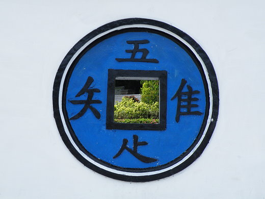 古代錢幣因為中間留一方孔,故曰「孔方兄」,古人利用此一「口」字,創作回文,即「口」之右、上、左、下方依序加上「隹」、「五」、「矢」、「止」,即「唯」、「吾」、「知」、「足」四字。錢幣代表財富,有誰不愛?然人類欲望無窮,貪則惹禍上身,是以古人於錢幣鑄以「唯吾知足」回文,提醒人們,知足方得常樂。