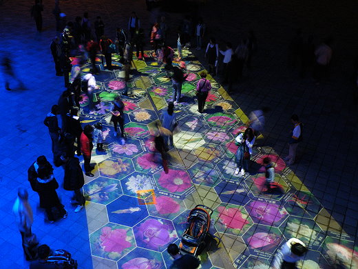 投影光雕有五個互動設計,測試階段只展演「花語寄情」,一踩在投影花苞上,玫瑰、向日葵、茶花、梅花等花卉就會瞬間盛開,還會出現花卉資訊,朵朵投影互動花海,恰與一旁地景花海「真花」形成有趣對比。