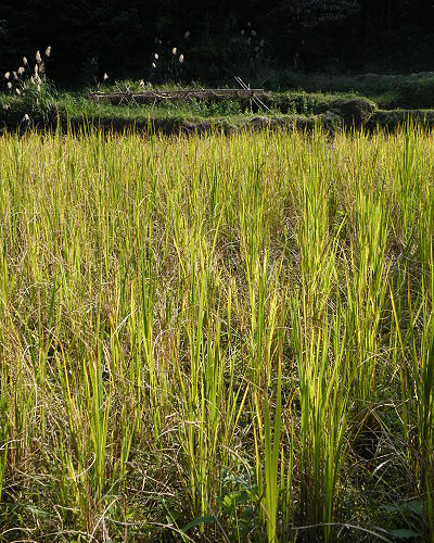 冬天的林家草厝前水田,已經收割,刻意留下的稻子黃葉,在陽光下閃耀,這般田園景色令人神迷。收割整地之後的水田內,一團團青蛙卵散佈水間,仔細找找,已可見黑色小蝌蚪聚集,過一陣子等青蛙卵全孵出來,將會更壯觀,在水田裡可見一條黑帶游動。