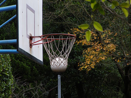 義方國小正對面的泉源48號公園足湯池是這趟黑白玩的第一個新景點,但不如心中打算,只好改到較熟悉的湖山國小,尋求額外的泡腳行程來補足,泡腳前先到陽明山前山公園小吃攤祭五臟廟,但遊客寥寥無幾,山上氣溫明顯比山下低個3-5度,紗帽山天空一半多雲一半微雨,只有勤快的熟客有機會遇上。籃球場邊的楓樹還殘留有黃紅葉,我顧不得還有雨絲,拿起相機就搶拍,這種命中籃網的好機會,怎可錯過。