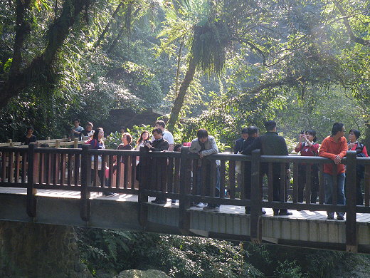 雖然在中午前抵達烏來,停車場卻已經沒有停車位,只好將車子開過觀光大橋,停在對岸,走烏來吊橋到停車場進老街用餐,飯後再走過攬勝橋分兩路進行,一些人排隊坐台車上烏來瀑布,其餘的走溫泉路到停車位置開車上山會合,再一同進入信賢村內洞森林遊樂區看瀑布探春。