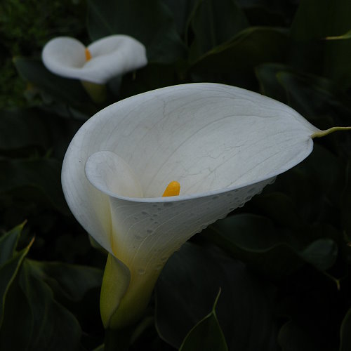 記得幾年前剛買傻瓜相機時,在微霧的天氣裡拜訪竹子湖,隨手將那時的滿園春色拍下,投稿攝影比賽,竟還有得獎,給了我很多鼓勵繼續拍照。自此之後,每年春天總要上山巡花幾次,訪櫻之餘,也與海芋相見歡。每年天氣不完全一樣,有時陰雨有時晴,晴天的時候,是拍藍天紅櫻的好時機;微霧的陰天,視野不佳,卻是細賞海芋的好時機,純白的花朵,油亮的葉子,在陽光照射下容易過曝,光線不佳的微霧天氣裡,反倒是海芋適合的曝光條件。所以,這次霧裡巡花,當然還是要避開大群遊客,尋找悠靜的海芋,留下紀錄。