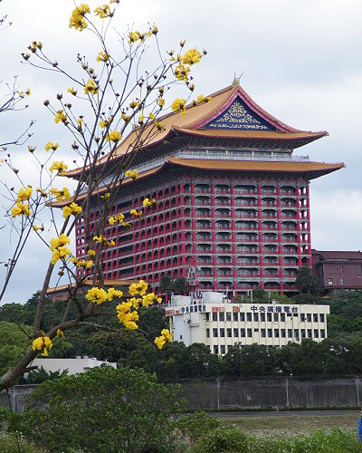 親自參與過活動後才發覺,這種慶祝活動不是一般花博遊客有機會體驗的,對於第一次來花博的人,絕對是趕進場看展覽,不會花時間在入口處排隊等著領那500張摸彩券,圓山展區入口分配300張摸彩券,其中150張給事先排隊遊客,另外150張另外開放一般入口發放,我才有機會拿到第8號摸彩券,可惜運氣沒那麼好,10萬元提貨券及數十項獎品得主通通不是我,不然就十全十美啦,只好隨手拿飲料及餐飲兌換券自我安慰一下。參加摸彩活動的遊客,需在大佳西區佳佳廣場待上約兩小時等候,以免大獎過門不入,所以,其他展區的活動通通要放棄,還好今天天氣沒那麼好,很多展場白天參觀人多,我也不用跟別人排隊耗時間,趁等候時間,順手再次紀錄大佳西區的一些展示,這裡有移植一些山櫻花,都已生葉結果,春節期間應該很漂亮。現在是黃花風鈴木的花期,剛好搭配圓山飯店遠景,特地留下紀錄。