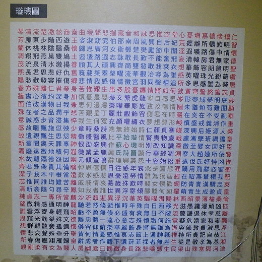 回文亦作迴文,因為句中詞語反復使用,詞序又恰好相反,而造成一種周而復始,首尾迴環的妙趣。回文詩的創作,最早當溯至晉代蘇伯玉妻所作的〈盤中詩〉。相傳蘇伯玉出使在蜀,久不回家,其妻思念已極,寫此詩於圓盤中寄予他,取其盤旋回環之意,以表達纏綿婉轉的感情,據說蘇伯玉讀後即感悟回家。詩如下圖,其讀法為「當從中央周四角」唸起:「山樹高,鳥鳴悲。泉水深,鯉魚肥。空倉雀,常苦飢,吏人婦,會夫稀。出門望,見白衣....。」你能以下類推嗎?