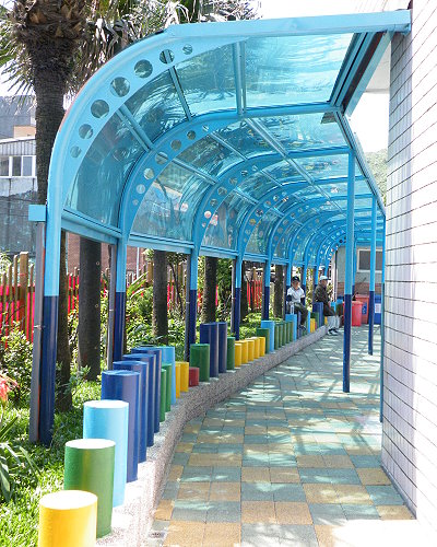 台北花博的超級周末,別人往圓山擠,我們家卻往東北角山海行,經中山高、台62線快速道路,不用1小時,便抵達瑞芳濱海的第一個國小,瑞濱國小。瑞濱國小不大,建於濱海公路的岩山旁,校園雖沒有濂洞國小與猴硐國小那樣,有小朋友喜歡的溜滑梯,卻也讓我印象深刻。那就是校園大門口兩側的高低起伏五彩圓柱,可當椅子坐,卻暗藏兩組數字密碼:334554321123322 334554321123211 22312343123432125 334554321123211;533422 1234555 533422 13553 2222234 3333345 533422 13551。改成音符哼唱,就會是mi mi fa so so fa mi re do do re mi mi re re,很耳熟的旋律,回家查詢後,其中之一正確解答為貝多芬交響曲第九號-快樂頌,中文歌詞相當適合今天的旅遊情境,這是我們想要的悠閒。