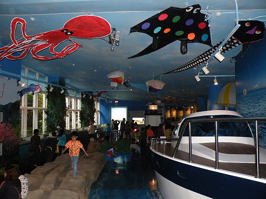 第二個點一路車遊北海岸,跑到白沙灣去看「北海岸遊憩探索館」,趁雨天人少時一探究竟,看看館內有哪些互動遊戲給小傢伙玩,沒想到很多人都趁雨天來訪(其實,一台遊覽車大概就要爆館了),小小探索館爆滿,騎腳踏車、衝浪板、開船的互動遊戲花時間較久,無法讓大家都盡興玩到,還好迷你潛水艇劇院機動加場,讓遊客欣賞3D影片,應該可以平息掉不少抱怨聲,但是,入館的收費規劃與活動時間分配,可能就需要從長再議。