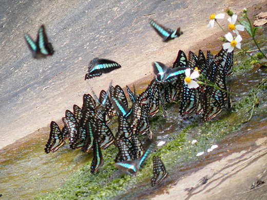 當然,餵魚絕對不是此行最大的收穫,而是溪邊處處驚奇的生態,石碇東街映入眼簾的的特殊建築景觀-吊腳樓,房屋大都懸空在河床上方,二樓的樓層涵蓋了樓下的房屋和街道,形成了不見天日街,屋子下方,沿溪旁還有步道相通,在炎炎夏日裡,正好是尋幽探險的好時機。處處可見蝴蝶飛舞,跟人們一樣,吸水是烈日下最常見補充水分的行為,好康逗相報,青斑鳳蝶、青帶鳳蝶、寬青帶鳳蝶群聚在一起,石墻碟、姬雙尾蛺蝶、小灰蝶則是各據一方。打鐵屋附近,還找到台灣草蜥,或許是吃飽撐著,淨看我們家兩攝手的動靜,嘴前的螞蟻則是不屑一顧,哈哈。