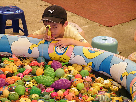時序初秋白露,又到了八里文旦採收期,上週有先到八里荖芊坑教育農場買了幾顆柚子回家存放消水,今天則是到八里左岸,想讓小傢伙體驗一下釣文旦的趣味,可惜已到最後一場,還好有人好心借釣竿給小史2號釣一顆大文旦,我才免於落入食言的困境。一旁棚架下的付費遊戲區,也有釣魚遊戲,花錢買避暑休閒。