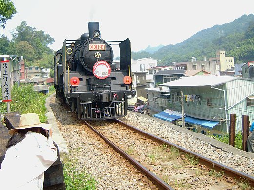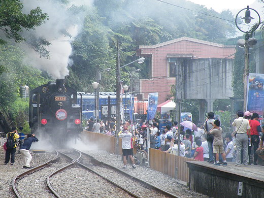 火車汽笛聲響,冒著煙的老火車頭來了,這在現今鐵路電氣化時代是看不到的,所以總要讓看過一次噴煙的火車頭才算了心願,火車進站停車,大家都把握機會圍在火車頭旁拍照留影,百年鐵道百年車頭,懷舊氣氛自心底起,等到汽笛聲再次響起,目送老火車頭離去後,菁桐車站又恢復成遊客可以親近的鐵道老站。