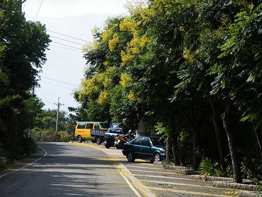 雨勢被大屯山擋住,車行過淺水灣陽光露臉,大家的心情也如雨後天晴,下車曬一下溫暖的太陽,新生活農場的台灣欒樹黃花在藍天白雲下相當醒目。繞了一下三芝淡水的山路,發現大屯溪中段有隱藏的荷花田,比起夏日的波斯菊田的枯槁,這裡秋荷還有些看頭。