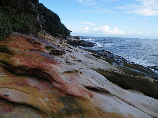 過洞後,眼前是一片無人的海岩岸。山壁緊臨著海岸,下層石英砂巨岩遍佈,岩面多紋理,與野柳海岸的岩理頗相似,離海水近的岩縫綠藻間,有岩蟹爬行覓食,人來它藏,人去它現身。離海水遠的岩石,則是岩面晰白而又含染橘褐紋色,自然彩繪,渾然天成。這裡的海岸原無步道,但岩與岩間已有人工科鑿出階梯痕跡,方便行走。從水尾漁港穿過一線洞,走到神祕海岸,比較輕鬆。