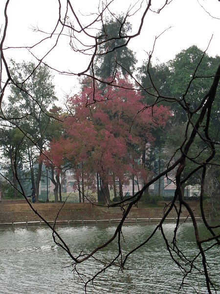 在冷鋒來襲,壟罩北台灣的寒天裡,看樣子,拱北殿是去不得,改帶老婆南下新竹躲雨,期盼可以有較好的天候。一路上冷風細雨,陪伴我們到新竹,光復路上的溫度計顯示氣溫攝氏11度,今天寒流躲不掉,細雨倒是有短暫停歇,硬著頭皮在冷風中尋自在,清華大學學生上課去,我們則是一路從相思湖畔,走過青楓綠葉滿佈的楓林走道,經體育館運動場,從梅園入口進入探梅花初綻。上到月涵亭回相思湖畔,再走一段清華蝴蝶園,不過冷天裡,找不到躲起來避冬的蝴蝶們,只好悵然折返。青楓葉還綠,倒是成功湖畔烏桕早一步滿樹紅,不至於讓我們空手而返。