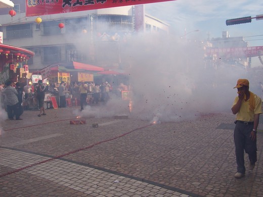 跟著媽祖去旅行,體驗到今年的另一個主題是環保之旅!雖然媽祖鑾轎所經之處都是長串鞭炮迎駕(如上圖),地上遺留成堆雜屑,但均有專人隨後即行清理(如下2圖),可注意清潔隊志工帽沿上〝媽祖繞境、台灣乾淨〞的標韱!這是在新港境內。