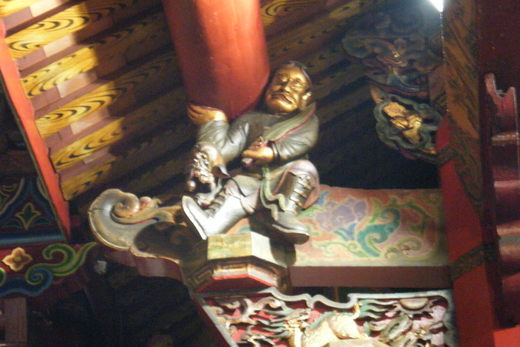 憨番擔樑【如上、下圖】這是一級古蹟台南天后宮、天壇、--等明鄭、清初古建築內主樑上特殊的結構及裝飾藝術品。細觀其人物造形上圖者手持蕉葉、下圖者手捧元寶,究其竟有代表招財進寶之意!