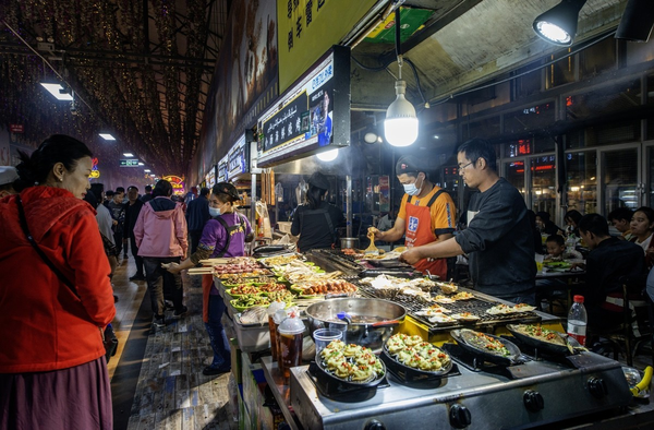 和田古稱河闐,素有世界玉都、地毯之鄉美稱,老城區是傳統的維吾爾建築風格,街區的巷子呈環狀,故稱環城。晚餐後參觀和田夜市(非露天),販售各種甜點飲料、羊肉料理、牛肉料理--,看到清燉羊腳蹄膀,顧不得已經飽橕的胃腸,買了一大塊嚐嚐,跟導遊反映為何不就在夜市享受晚餐?