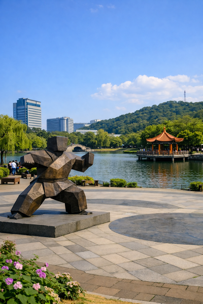 瞧那青山環抱,荷花朵朵,拱橋流水,亭台樓閣,岸旁參天古樹,太極藝術陪伴,放眼望去,視野無不美到極致。