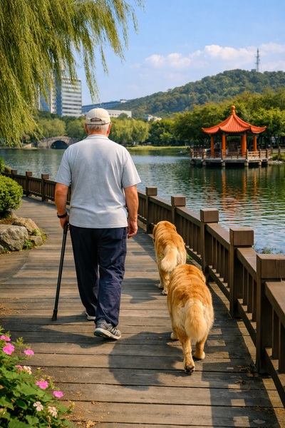 另一位先生,每次走路時,總有兩隻大黃狗一前一後隨行。我笑稱:左右護法相隨,真威風!他聞之,總是開懷大笑。隨著歲月流逝,護法步伐漸漸闌珊,與主人愈來愈遠。有時只見主人獨行,問他護法呢?他說,走不動了,有時要逼他們,才會出來。畢竟狗齡已近90啦,人會老,狗也會老啊!