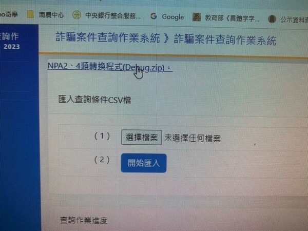 首次到南農網站登入下載轉換工具,在”小組詐騙案件查詢作業系統”,下載”NPA2、4類轉換程式(Debug.zip)”轉換程式壓縮檔,解壓到履歷系統PC,之後點開Dubug 文件夾執行 NpaSys24.exe 檔案進行轉換交易明細成CVS檔。