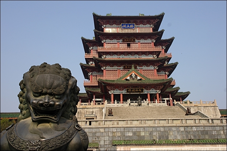 學生時讀到滕王閣序,除了對王勃詩文才華的敬佩喜歡,其中「落霞與孤䳱齊飛,秋水共長天一色」等傳誦千古的名句,使我們對此閣更有一份企盼與想像。今日登樓,一面欣賞大唐盛世建築,文物風格,從壁上懸掛的巨幅瓷板畫—樂舞圖,也顯露出當時王侯、官紳雅集的豪放奢華,思古之幽情不由興起。