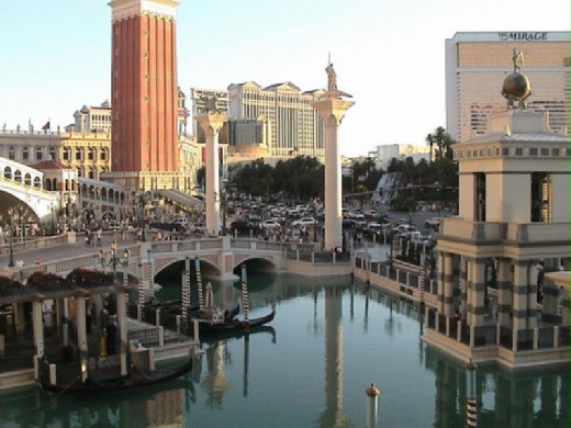 賭城別出心裁的建築,倒是挺有看頭。在那條主要街道(The Strip)上,一個個精緻氣派、造型各異的豪華大賭場及酒店秀場,有紐約、巴黎、羅馬、威尼斯、埃及、狄斯奈樂園,熱帶雨林……等不同造型主題,簡直是個迷你地球村。各賭場也都是金碧輝煌的極盡奢華之能事,十足浮華世界的一個縮影。