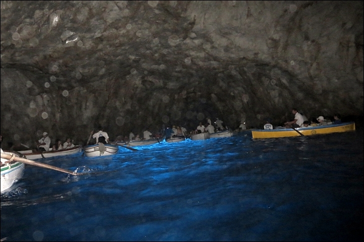 卡不里島藍洞,被譽為世界七大奇景之一,因為在陽光照射下,洞內的海水會呈現不可思議的晶藍色,讓身歷其境的人驚嘆不已,成為義大利另一個搖錢洞。我們坐了1.5小時大、中船到達洞口,再等了1小時換上3人小舟,在船夫引領下,進入這片奇特景象中,洞口小到僅1平方公尺,所以連船夫都要扒下來拉著牆上鐵鏈划進,而且,適巧一陣浪來打得我們全身濕透,也好不驚喜,雖僅短短兩三分鐘就出洞,可是由於當天日照非常強,在約4×10公尺黑洞中,確實看到那奇妙的碧藍。