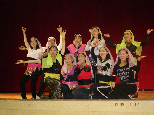 爲了這次表演,我們從十一月底就開始練習,因為限於學校場地,週一、三、五每天練半小時,週六週日則各一個半小時左右。服裝方面以自製、省錢為原則,學員各自在菜市場地攤找合適的配件。頭巾則由我負責設計製做,花了一個多月時間才準備就緒。待眾人披戴上身,霎時個個搖身變成活脫脫的阿拉伯美女。我們忘情的隨音樂款款擺動,笑靨迎人,自娛也娛人,其樂融融。