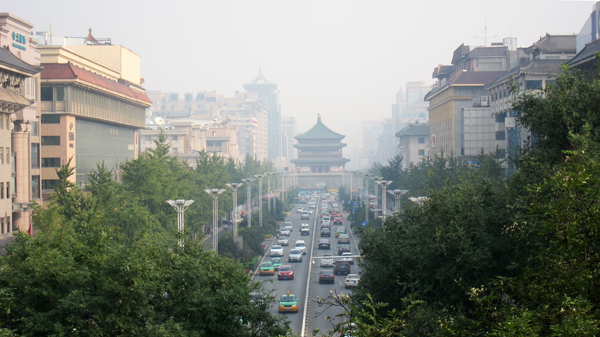 站在南寧門城牆上,從南大街遠望過去,是城中心有名的鐘樓(下圖),鐘樓是西安標誌性建築,初建於明洪武17年(1384年),萬曆10年(1582年)移建城中心現址,樓上懸掛大鐵鐘,建築古樸、典雅,是一座具有典型明代藝術風格的古建築。因為在市中心,所以這趟自由行,我特別早早就將住宿處訂在附近,出門只要走兩分鐘就可以看見鐘樓,通往城內各景點也都很方便,離鼓樓、回民街、明長城、碑林、書院街都很近,最遠的步行10多分鐘左右就可到達。