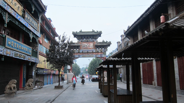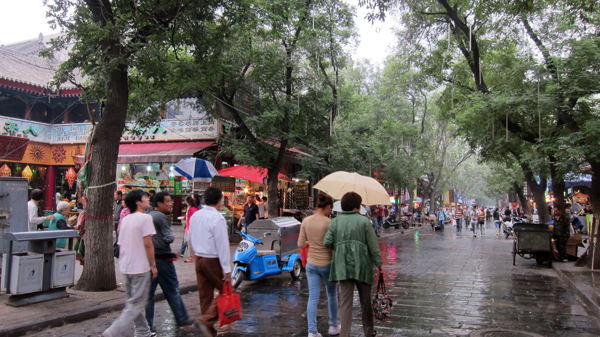 「鼓樓」離我住宿處也只兩三分鐘的腳程,而知名的「回民街」就在「鼓樓」廣場。這兒可熱鬧了,它以濃郁的穆斯林文化和氛圍,為古城構築了一道特異的風景線。以青石鋪路,綠樹成蔭,路兩旁一色仿明清建築,或餐飲,或器物,均由回民經營,具有清真特色,深受遊客的喜愛。我和家人都很喜歡來此遊逛,欣賞別有特色的工藝品,有製作皮影的,絲綢工藝背包的,民間剪紙、茶具及玉製品、果核工藝品等等。也順便解決民生問題。