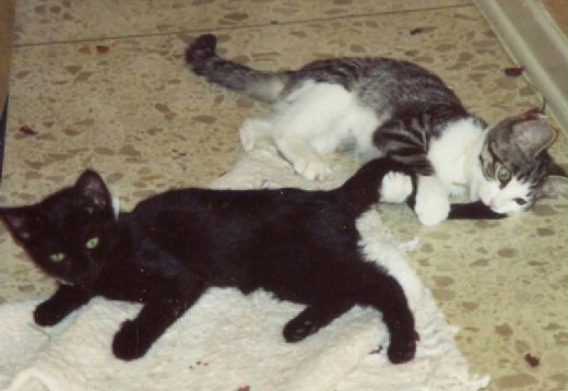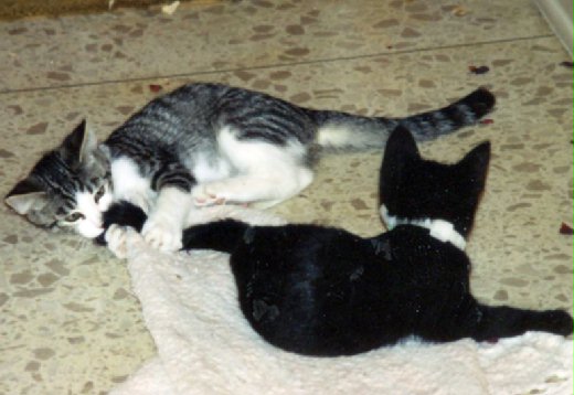 我和妹妹對新家越來越滿意,有很多傢俱可以跳高躍遠或玩躲貓貓。尤其在柔軟的地毯上練習摔角相撲,踢咬廝殺最過癮。媽咪會在一旁笑眯眯的拍照,我們於是更起勁了。偶而同時躍起,在半空中相抱後才掉到地上滾兩滾,完全是超人電影的那種特技表演,引來媽咪爸比驚嘆不止。