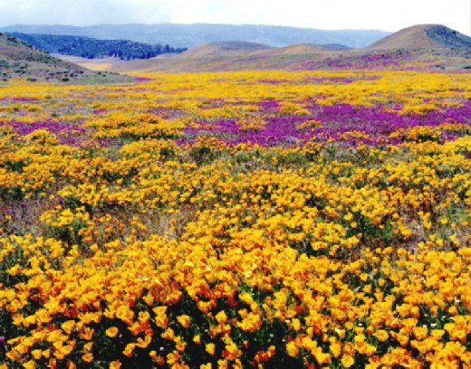 待安定下來,才發現南加的確沙漠環繞,此地涼冬是雨季,荒漠多半會冒出綠油油的小草,可一到夏日天乾物燥,立刻變成枯黃一堆。等秋風肆起,可怕的山火季節就開幕了。有年春天某日,洛杉磯時報刊出一幅圖片,上有連綿不斷的山坡,奇的是山上彩色繽紛,彷彿調色盤打翻了。等細讀説明文字,才恍然洛城北郊的羚羊谷(Antelope Valley)正在上演野花秀,加州罌粟花開得如火如荼。土包子的我,將信將疑,不能想像以前那片荒原,可以脫胎換骨成這般不類人間的仙境。