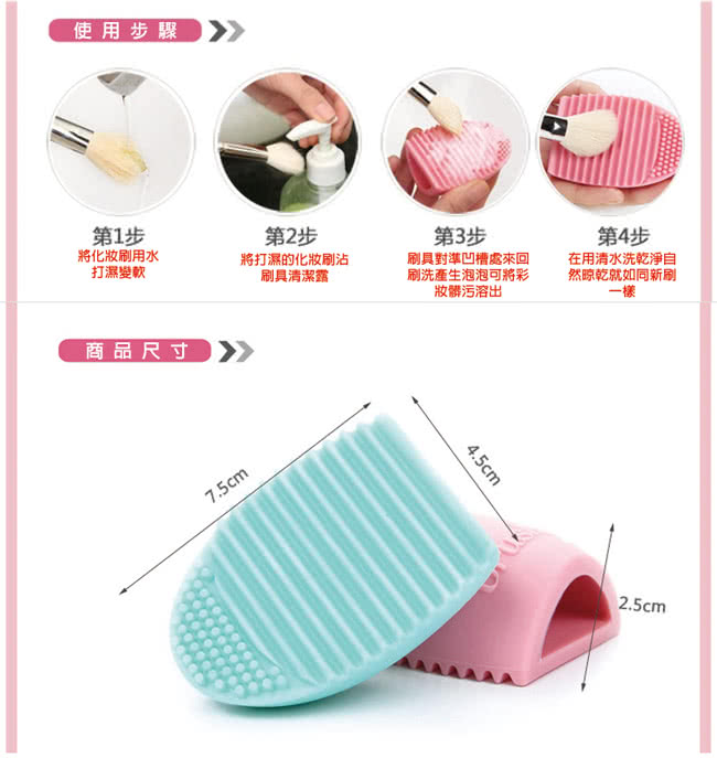 推薦刷具清潔露搭配蛋型洗刷版使用,洗刷具不需在用手清潔,蛋型刷具洗刷版的直條紋和交錯的面可洗大支刷,點點孔可以洗中小支刷具,把刷具洗好後,刷具頭朝下掛在洗曬架自然曬乾,保?刷具防止毛分叉,也可以刷具頭朝上插在架上,當收納工具,方便化妝時拿,一台兩用好方便。
