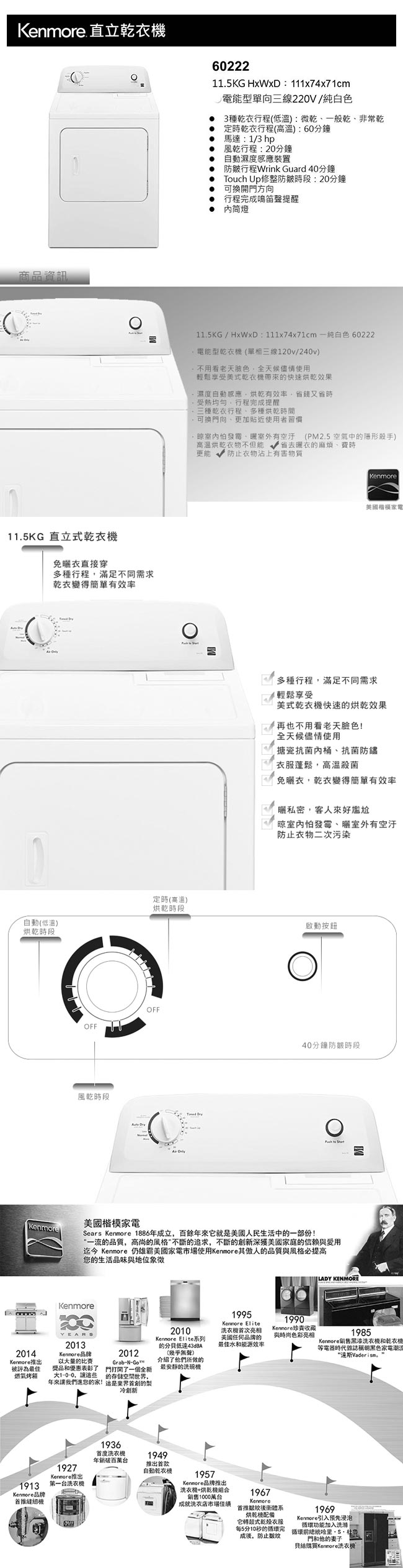 送 基本安裝+舊機回收【美國 楷模Kenmore】11.5KG 直立式乾衣機 -電能型 60222-本周折扣