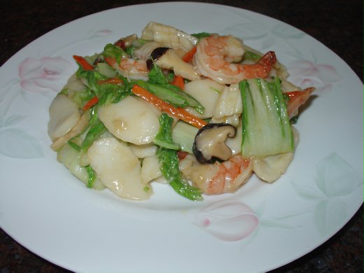 就加入青菜和已炒好的海鮮再拌炒一下,