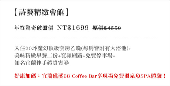 商品訊息簡述: 只要1699元(雙人價)即可享【詩藝精緻滅]】原價4550元年終驚奇破盤價:入住20坪魔幻頂級套房乙晚(每房皆附有大浴池)+美味精緻早餐二份+寬頻網路+免費停車場+知名宜蘭伴手禮貴賓券。好康加碼:宜蘭礁溪68 Coffee Bar享現場免費溫泉魚SPA體驗!