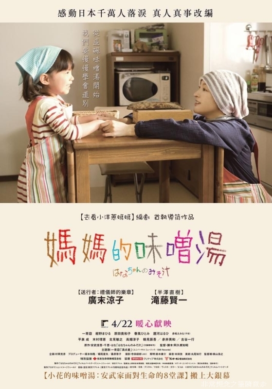 真人真事之暢銷散文【小花的味增湯:安武家面對生命的八堂課】,搬上大螢幕,由廣末涼子演出罹患乳癌的母親千惠。