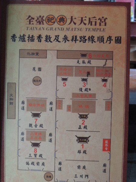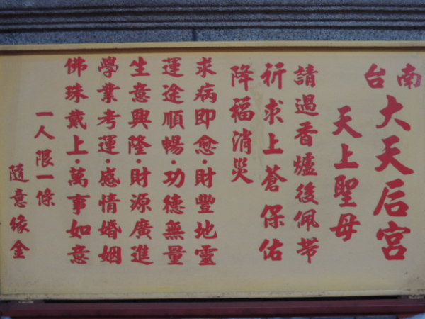 因為台南市的一磚一瓦都是古蹟,參訪廟宇也有其要領。正確的參觀方式首先應該站在廟宇門外,然後看古色古香的廟宇外表,然後才進入廟宇內。進入廟宇第一件事,先看看這座廟宇有沒有古碑,有古碑的話就大致了解一下碑文的內容,碑碣除內容豐富、深具史料價值外,也是造型藝術的表現。大天后宮《平台紀略碑記》記錄著施琅立的碑文,內容如下:『臺灣遠在海表,昔皆土番、流民雜處,未有所屬。及明季時,紅彝始有築城,與內地私相貿易。後鄭成功攻佔,襲踞四世。歲癸亥,餘恭承天討;澎湖一戰,偽軍全沒,勢逼請降。餘仰體皇上好生之仁,以八月望日直進鹿耳門,赤崁泊艦,整旅登岸受降,市不易肆,雞犬不驚。乃下令曰:‘今者提師跨海,要在平定安集。納款而後,台人即吾人;有犯民間一絲一枲者,法無赦’!士無亂行,民不知兵。乃禮遣降王入京;散其難民盡歸故里,各偽官兵載入內地安插。公事勾當,遂以子月班師。奏請於朝,為置郡一、縣三;分水陸要地,設官兵以戍之。賦稅題減其半。夫炎徼僻壤,職方不載;天威遐播,遂入版圖。推恩陶俗,銷兵氣以光文治,端有望於官斯土者。是不可以無記。』只要唸了碑文,就可以了解大天后宮的沿革。看完古碑之後,緊接著要看匾聯。『匾』是皇帝、地方的官吏或士紳獻的,『聯』則是寫著所供奉神明的由來,或者是先民渡台,來此披荊斬棘開拓的過程,這些很有意義的史料,大天后宮裡有康熙帝御賜【輝煌海澨】匾、雍正帝御賜【神昭海表】匾、乾隆帝御賜【佑濟昭靈】匾、咸豐帝御賜【德侔厚載】匾、光緒帝御賜【與天同功】等清代帝王御筆親題匾額及文武官員敬獻之匾額,最具歷史價值。一般說來,廟宇正殿的主神,是最重要的。不過,正殿左右兩旁及後面所供奉的神像,我們也不能忽略,在那些地方往往能發現到出乎意外的珍貴史料及民俗標本,記得以廟宇格局的鳥瞰圖,對應參觀廟宇的格局。參觀廟宇,不但前景、內景要看,就連側景、後景也要仔細觀賞,前後左右都要轉一轉,如此才能真正了解其豐富的文化意涵。