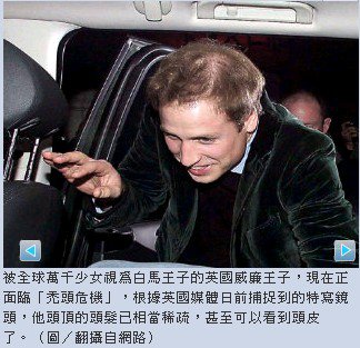 英國威廉王子7月24日參加慈善活動並為2012年倫敦奧運會做宣傳。不過,這次引起英國媒體關注的卻是威廉王子頭頂日漸稀疏的頭髮。據報,此前威廉王子為了醫治禿頭還尋求中醫療法。
