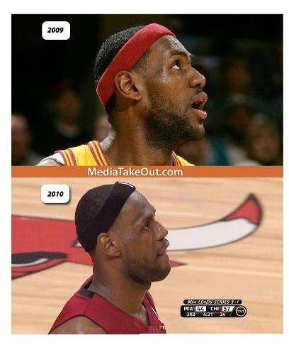 記者陳浚錡/綜合報導 邁阿密熱火隊主將「小皇帝」詹姆斯雖然貴為超級球星,但人氣卻持續低迷,近來球隊打進總冠軍戰,美國小媒體們又拿他來作文章,《mediatakeout.com》爆料,從03年開始,也有「雷霸龍」之稱的詹姆斯(LeBron James)頭帶戴得愈來愈高,結果發現,他是為了遮住日漸撤退的髮線才這麼做。