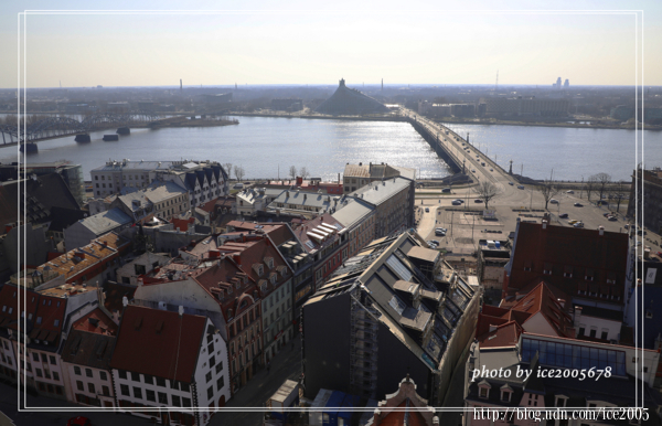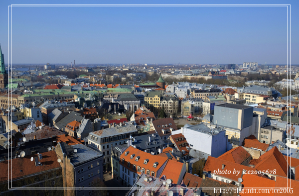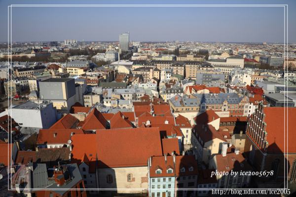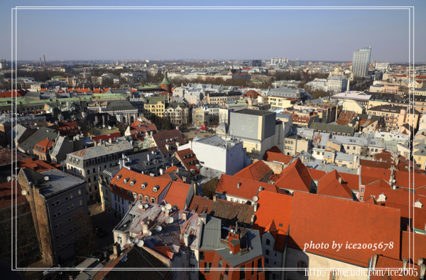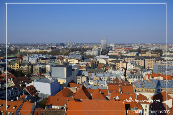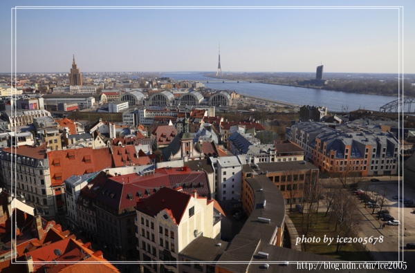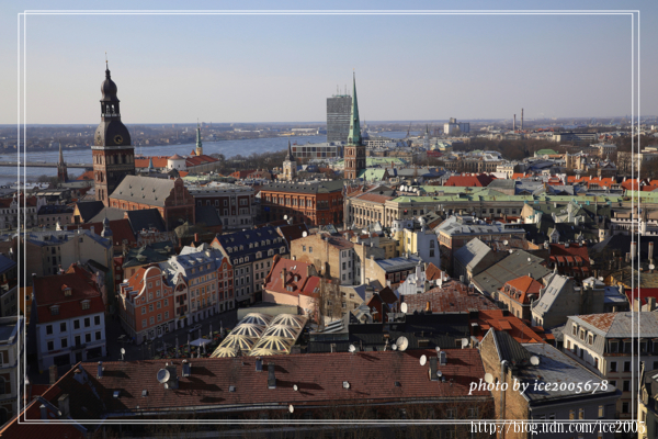 #5.從聖彼得教堂(Svētā Pētera baznīca)俯眺里加城市風光………72公尺高的觀景台視野遼闊,整個里加城市景觀盡收眼底,大略介紹一下:右邊那條河流就是道加瓦河,最遠處的那座高塔是里加廣播電視塔,左邊那棟史達林建築風格的建築物是拉脫維亞科學院,前方中央處的四連棟建築物就是里加中央市場,跨過鐵路的這區就是里加舊城區。