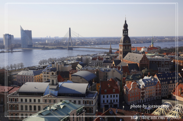 #14.從聖彼得教堂(Svētā Pētera baznīca)俯眺里加城市風光………畫面中央那座尖塔是聖雅各教堂(Sv.Jēkaba Baznīcā),它是城裡唯一的一座哥德式尖塔教堂,左邊靠近斜張橋的那座建築物是始建於1330年的里加城堡(Rīgas Pils),不過,該城堡歷經多次的改建,已經失去城堡的韻味了,目前是拉脫維亞歷史博物館、外國藝術博物館及總統官邸。