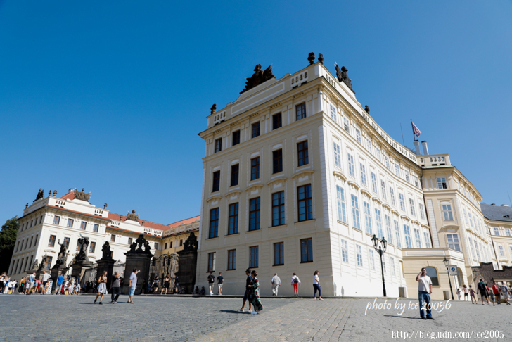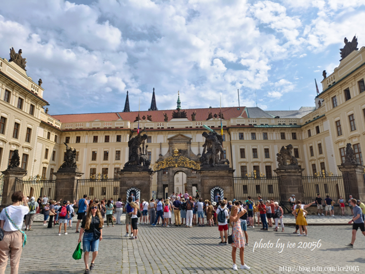 #21.近看布拉格城堡 Pražský hrad.........中庭入口處除了有衛兵站剛外,大門上飾有二對雕像,名為「對戰的巨人們」,這些雕像出自十八世紀後期I.Platzer之手,目前所見的雕像是二十世紀初的複製品。