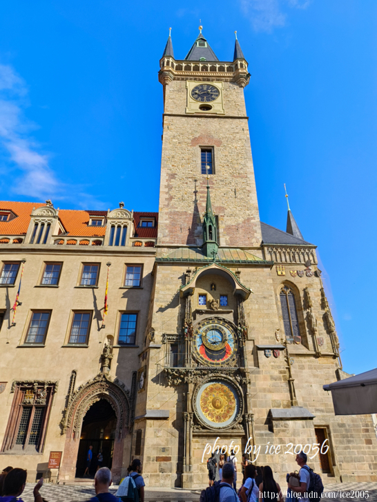 #7.近看天文鐘 Staroměstský orloj........這座設計繁複的天文鐘位在舊市政廳南側的牆上,它也是最著名的天文鐘之一。天文鐘的核心部分完成於1410年。鐘盤上畫著代表地球和天空的背景, 並且有四個主要的移動的圓盤,分別是黃道十二宮圓盤,老捷克時間表,太陽和月亮。另外,在天文鐘下方的日曆星座盤是1870年增加的。