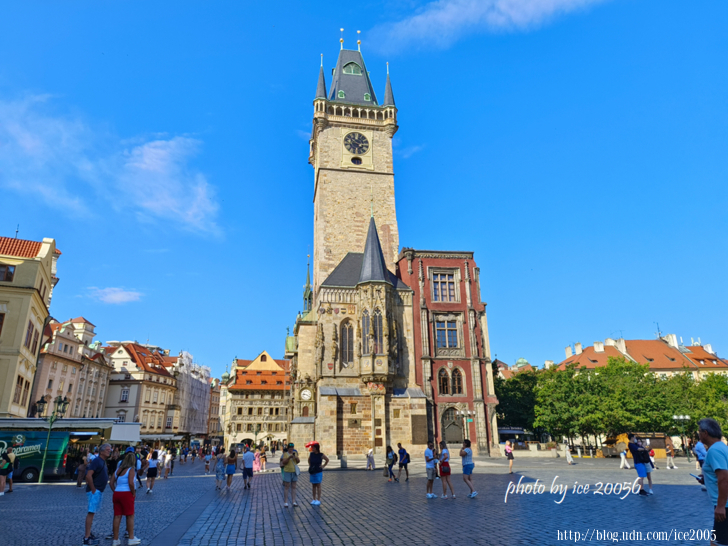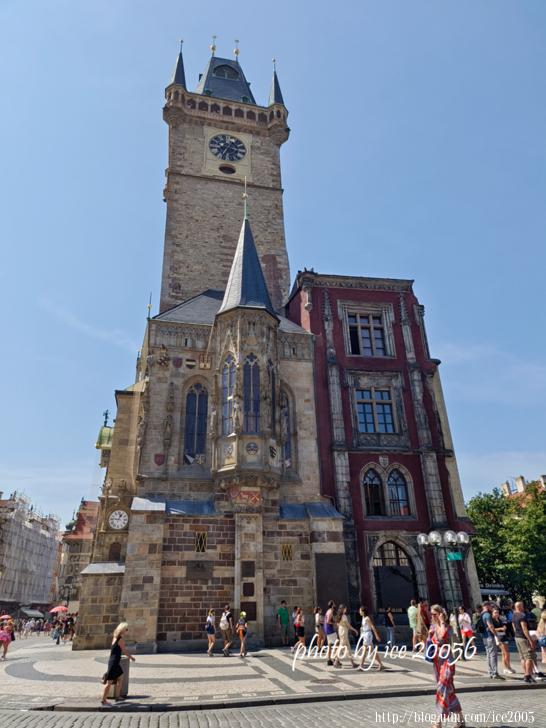 #5.廣場上的舊市政廳 Staroměstská radnice一隅.......集不同建築風格於一身的舊市廳與提恩教堂相對著,其最知名的景點是天文鐘,現在所見的舊市政廳是二次大戰毀損後修復的........