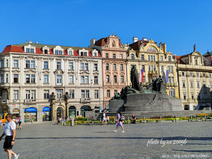 #4.廣場上的胡斯雕像 Pomník mistra Jana Husa........胡斯是十五世紀的捷克宗教改革先驅,由於嚴厲批判天主教的墮落(販賣贖罪券)而被認視為異端,接著被教廷送到康斯坦茨審判,最後在1415年處以火刑,而後引發1419~1436年的胡斯戰爭。胡斯雕像是在其死後500週年的1915年設置的,該座雕像出自雕塑家Ladislav Šaloun之手。