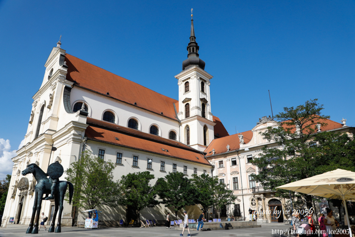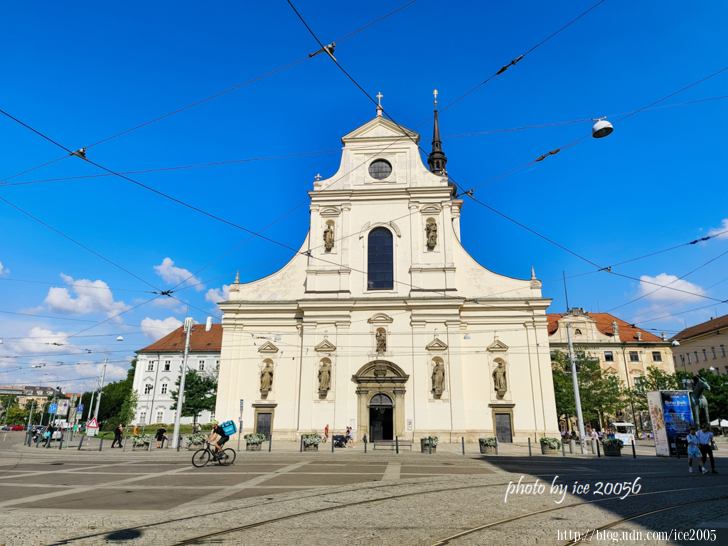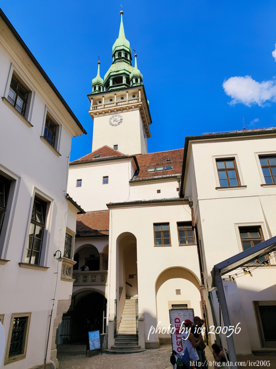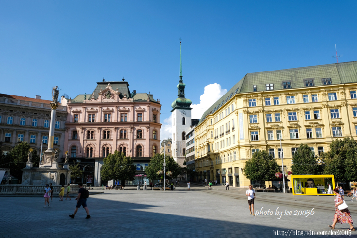 #4.自由廣場(Náměstí Svobody)一隅.......畫面前方那座高聳的銅綠尖塔,哥德式的白色建築物就是聖雅各伯教堂(Kostel sv.Jakuba),聖雅各伯教堂建於13世紀的教區教堂,從14世紀後半期到16世紀後半期陸續被改建,形成目前所見的樣貌,改建時加上的92公尺哥德式尖塔是舊城區最醒目的地標。聖雅各伯教堂最吸引遊客之處在於它的地下萬人墓穴,據說墓穴中藏有50000具人骨,是歐洲第二大的萬人塚。另外,在1995年,聖雅各伯教堂被列為國家文化古蹟。