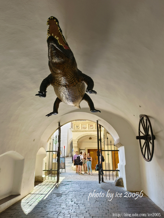 #20.舊市政廳(Staroměstská radnice)通道一隅.......天花板上懸掛著一隻象徵城市的龍(鱷魚),牆上並掛著一個木車輪。無論是龍(鱷魚)或是木車輪都有故事流傳於街坊,在此就不八卦了!