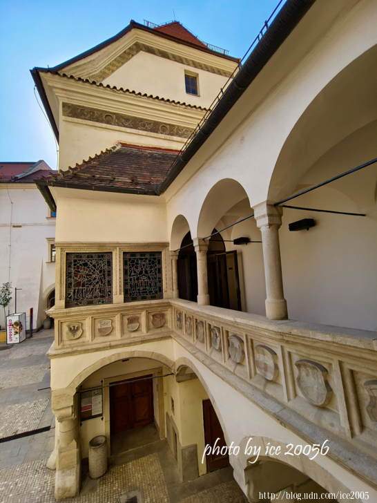 #19.舊市政廳(Staroměstská radnice)外觀一隅.......舊市政廳建於1240年,是布爾諾舊城區最古老也是最重要的歷史建築,今日所見的哥德式入口大門建於1510年。拱門上方共有5根飾柱,雕刻著騎士與聖人像,但是中央那個象徵正義的正義女神飾柱卻是彎曲的,傳說因為市政府短付了款項,因此這個雕刻工匠故意把正中央那個飾柱給造歪斜。舊市政廳目前已改為博物館使用,那座高達63公尺的塔樓,是眺望整個舊城區的好地方。